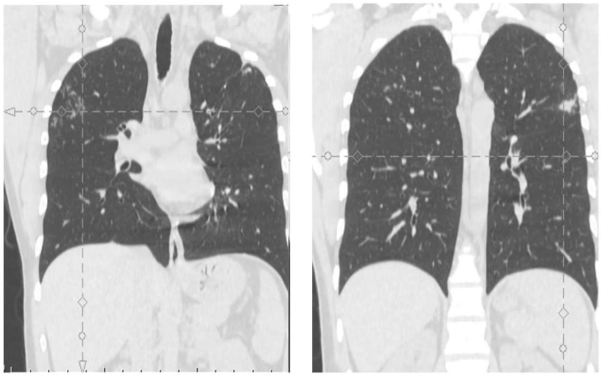 Диагноз. На основании анамнеза, данных объективного осмотра, лабораторных и инструментальных методов исследования, рентгеновской томографии поставлен диагноз: А16.0 Очаговый туберкулез S1–2 обоих легких в фазе инфильтрации без выделения микобактерий туберкулеза.