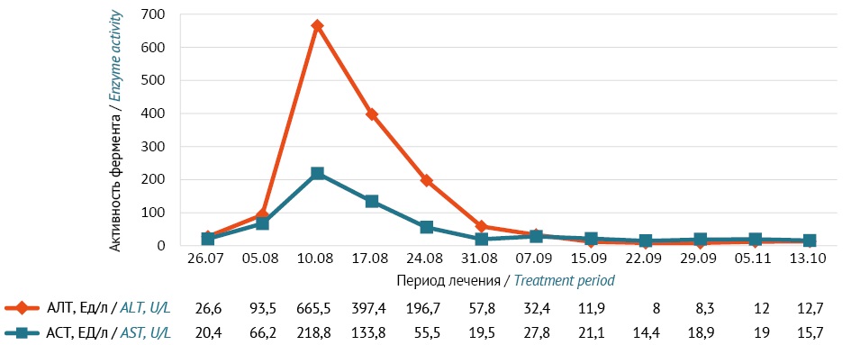 Динамика и исходы. В результате этих мероприятий у пациента улучшилось самочувствие, в крови нормализовались активность АЛТ и АСТ (рис. 2). Через 21 сут возобновлена противотуберкулезная химиотерапия изониазидом, доза которого снижена до 300 мг/сут (5 мг/кг/сут). Другие противотуберкулезные средства пациент продолжил принимать в ранее назначенном режиме.